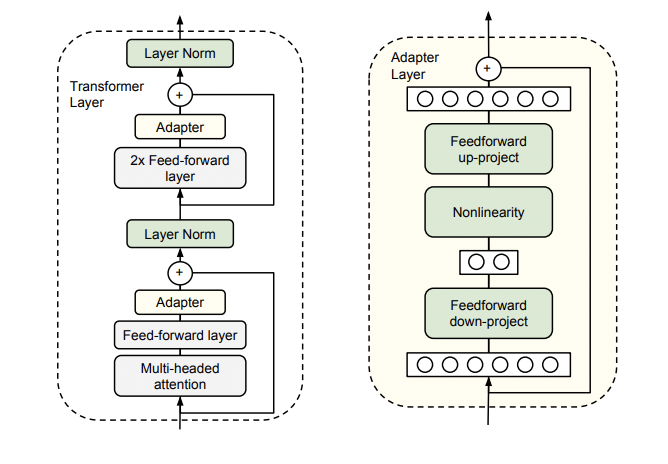 Adapter型は、Multi-Head-Attention層とFeed-forward層の出力を入力として受け取って、新たな出力をする追加の層を挿入する方法です。事前学習したパラメータは変更せず、新たに挿入したAdapter層のパラメータのみをファインチューニングで最適化します。