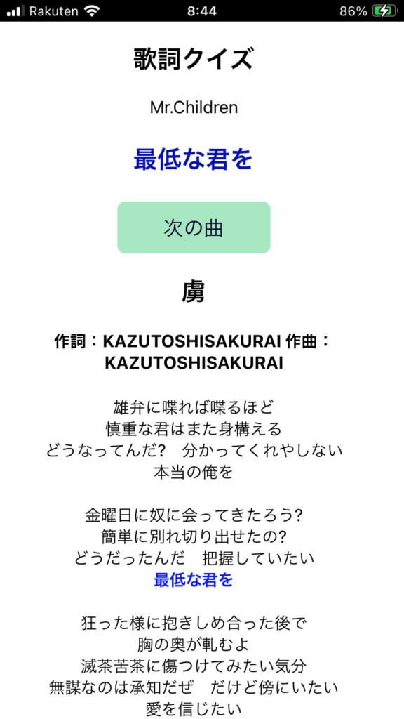 歌詞から曲名を当てるクイズアプリ(ミスチル版)