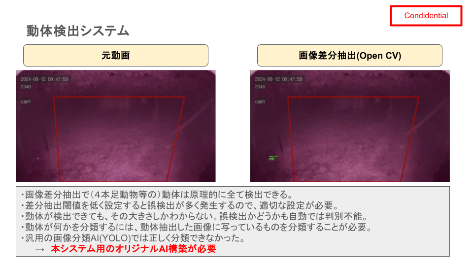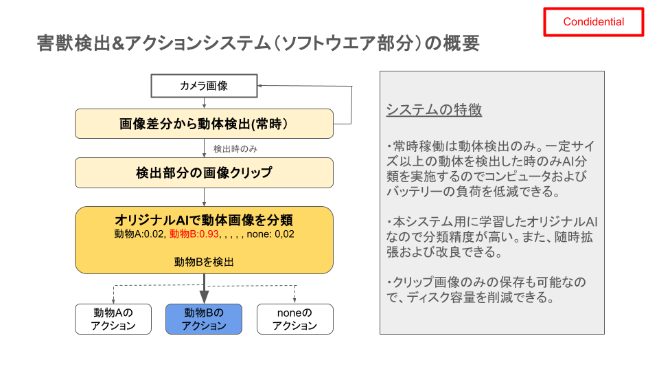 熊、猪、ハクビシン、アライグマなどによる農作物の被害が深刻になってきています。動物が接近したことをリアルタイムに検知して、動物の種類に応じた対応を行うためのカメラシステム(ソフトウエア部分)の開発について紹介します。例えば次のよう赤外線カメラ映像からリアルタイムで動物種類を分析して、動物Aならライト点灯、動物Bなら唐辛子エキスのスプレー、動物Cなら爆竹音、というようなアクションを行う装置です。