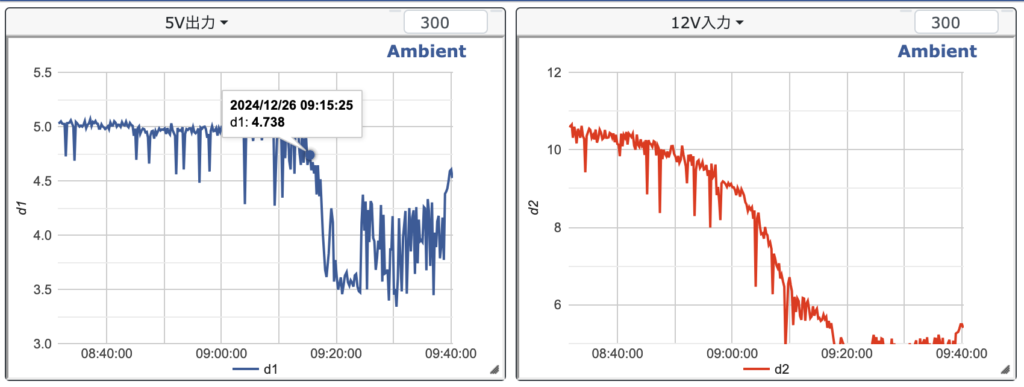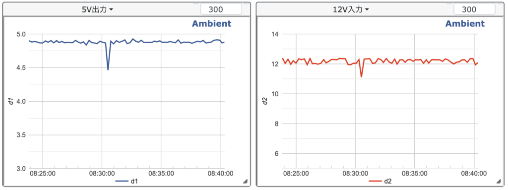 8:24にテスト開始。出力5Vに調整していたが少々低め。