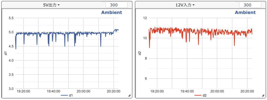 12時間後のデータ。一旦ここで中断して翌日再開予定。20:20のところで5V出力が上がっているのはラズパイをシャットダウンしたことによる。